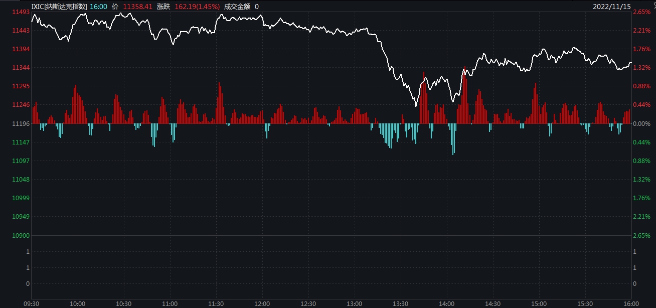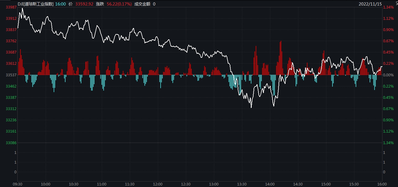 美东时间11月15日16:00(北京时间11月16日05:00),道指收涨56.22点,报33592.92点,涨幅为0.17%;纳指收涨162.19点,报11358.41点,涨幅为1.45%;标普500指数收涨34.48点,报3991.73点,涨幅为0.87%。