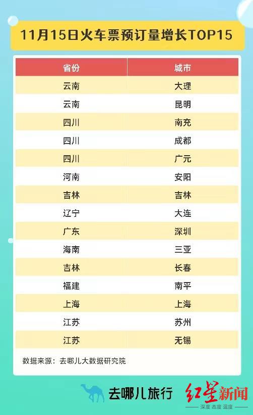 与此同时,热门旅游城市、线路产品也成为网络搜索的重点。在去哪儿平台上,火车票预订量增长明显,大理、昆明、南充、成都、广元、安阳、吉林、大连、深圳、三亚是城市增幅前10,上海、浙江、江苏也稳定增长。随着冬季的到来,冰雪旅游、温泉旅游和海岛游成为用户最关注的旅行产品,长白山和崇礼的滑雪线路,广东、福建等省份的温泉游线路,三亚的休闲度假线路都受到游客的关注。