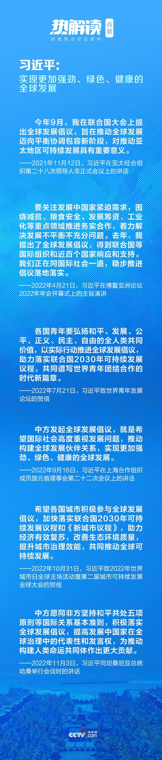 2021年9月21日,习主席在第七十六届联合国大会一般性辩论中首次提出以六个“坚持”为主要内容的全球发展倡议——“坚持发展优先”“坚持以人民为中心”“坚持普惠包容”“坚持创新驱动”“坚持人与自然和谐共生”“坚持行动导向”。该倡议为构建全球发展共同体找到了最大公约数,贡献了中国智慧和中国方案。此后,习主席又在不同场合对这一倡议进行阐释。