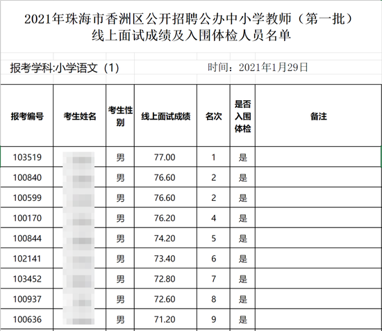 除了带有学历学校背景的拟聘名单之外,面试成绩、综合成绩也在珠海市香洲区教育局公开招聘中小学教师相关信息之列。红星新闻记者查询官网发现,2021年不同性别的面试成绩也有明显差距。以2021年小学语文教师岗位为例,入围体检的11名男生面试成绩处于70.8分-77分之间,而入围体检的11名女生面试成绩则为85.6分-92分,即相同岗位男生的最高分比女生的最低分还要低8.6分。
