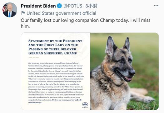 2021年6月19日,拜登曾转发白宫一则声明并发推称,“我们家今天失去了我们挚爱的伙伴‘冠军’。我会想念他的。”↓