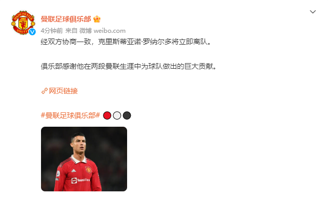 新京报讯,据曼联足球俱乐部官博消息,经双方协商一致,克里斯蒂亚诺·罗纳尔多将立即离队。俱乐部感谢他在两段曼联生涯中为球队做出的巨大贡献。