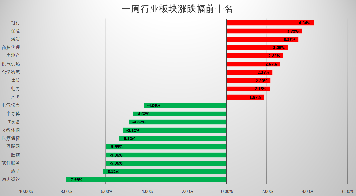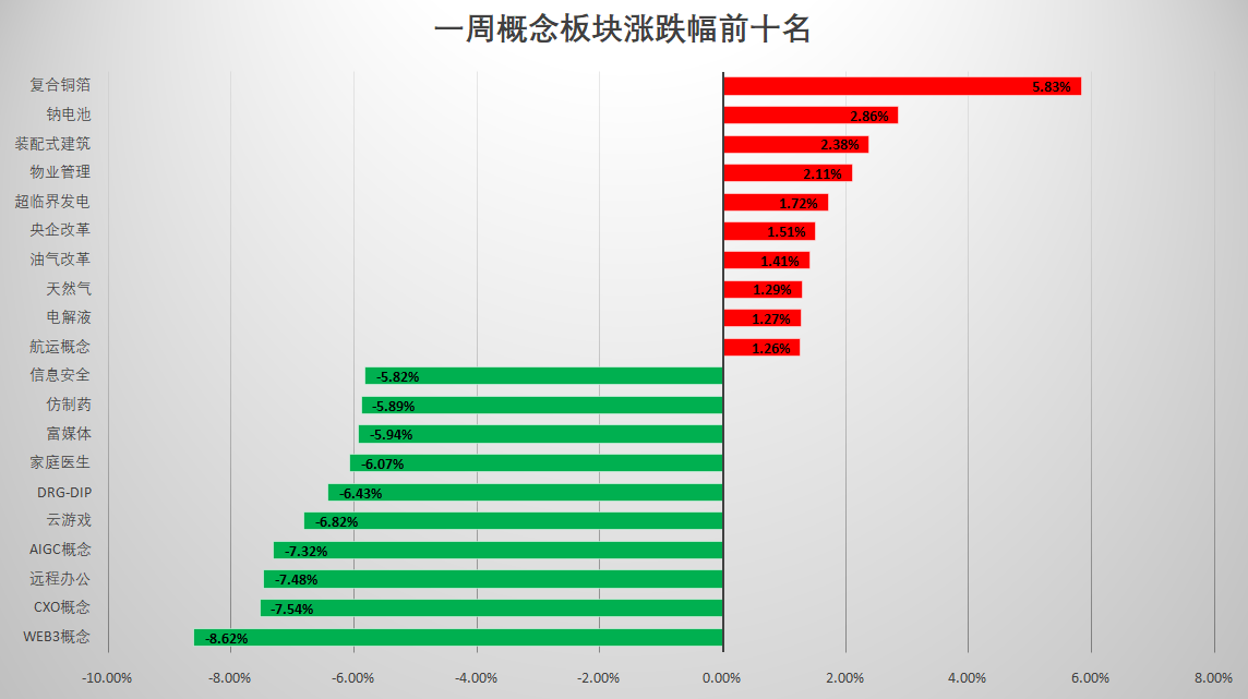 从一周板块表现来看,银行、保险、煤炭等板块领涨,酒店餐饮、旅游、软件服务、医药等板块跌幅居前;概念板块中,复合铜箔、钠电池、装配式建筑等板块表现强劲,Web3概念、CXO概念、远程办公等板块跌幅居前。