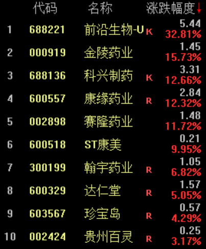上周医药板块表现突出,在涨幅榜周居首位,可是本周并未延续上周的涨势,累计下跌5.96%。个股方面,前沿生物-U领涨该板块,涨幅达到32.81%,金陵药业、科兴制药、康缘药业、赛隆药业同样表现就好,均涨超11%。