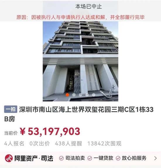 最终因为被执行人与申请执行人达成和解,并全部履行完毕,这场拍卖中止。