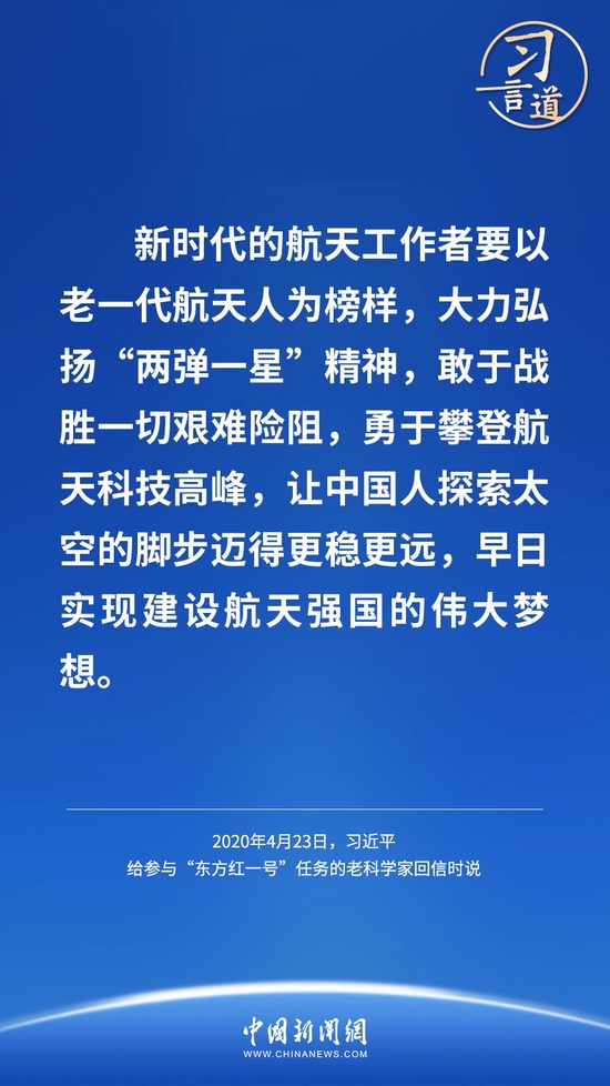 太空探索永无止境。习近平总书记多次强调要大力弘扬航天精神,勉励新时代的航天工作者以老一代航天人为榜样,让中国人探索太空的脚步迈得更稳更远。