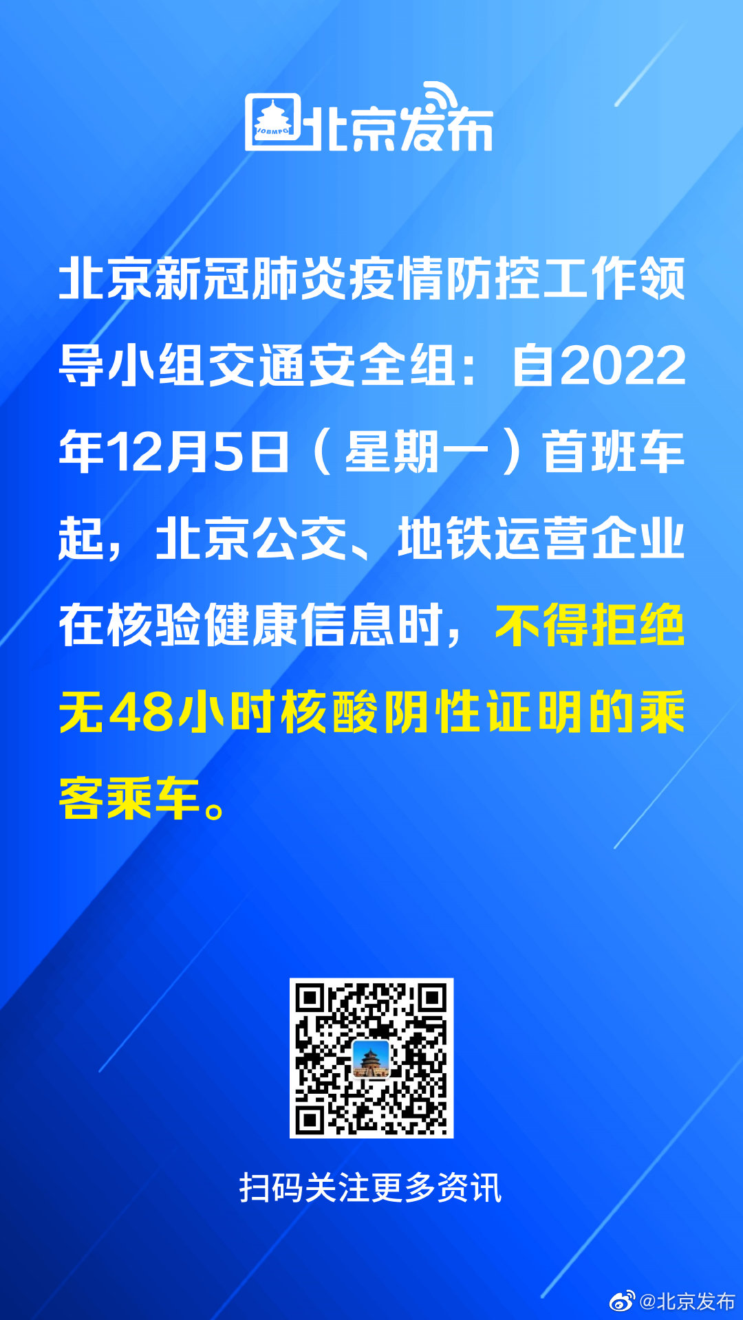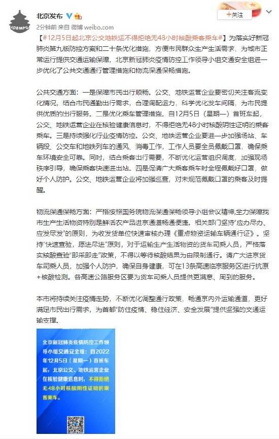 公共交通方面:一是保障市民出行顺畅。公交、地铁运营企业要密切关注客流变化情况,结合市民通勤出行需求,合理调配运力,科学优化发车间隔,为市民提供优质的出行服务。二是优化乘车管理措施。自12月5日(星期一)首班车起,公交、地铁运营企业在核验健康信息时,不得拒绝无48小时核酸阴性证明的乘客乘车。三是持续强化行业疫情防控。公交、地铁运营企业要进一步加强场站、车辆段、公交车和地铁列车的通风、消毒工作,工作人员要全员佩戴口罩,确保乘车环境安全可靠。同时,结合乘客出行需要,不断优化运营组织调度,加强现场秩序引导,确保乘客快速进出站。四是促请广大乘客乘车时全程佩戴好口罩,做好个人防护。公交、地铁运营企业将加强巡查,对未规范佩戴口罩的乘客及时提醒。