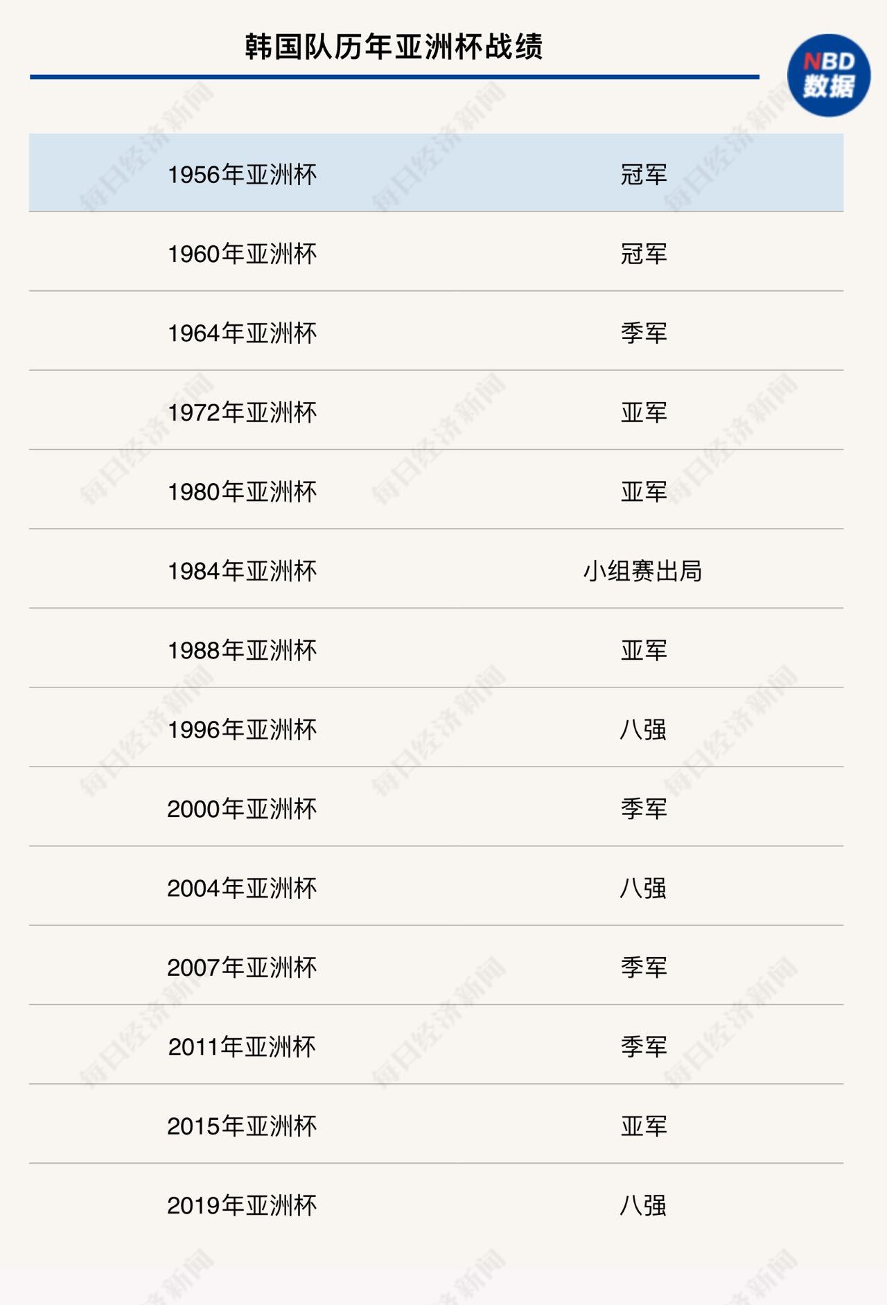 韩国队历年亚洲杯战绩(数据来源:亚足联,制图:每经编辑高涵)