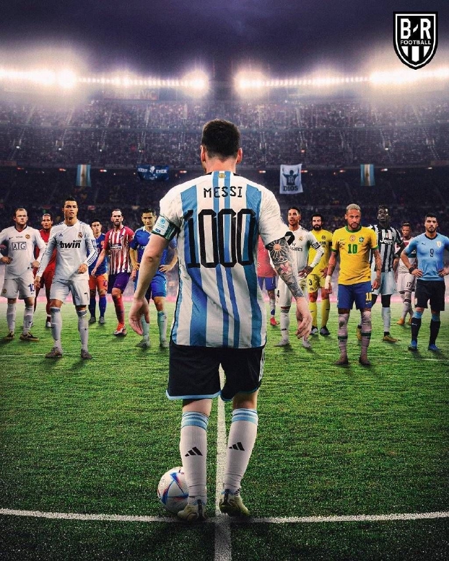 知名的足球社交账号B/R也为梅西制作了一张精美海报,上面是梅西穿着应有1000字样的阿根廷球衣,他一个人面对C罗、内马尔、苏亚雷斯、鲁尼、拉莫斯等和他同时代的球星。
