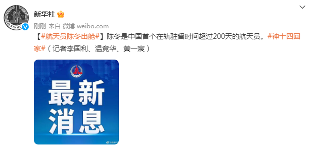 【#航天员陈冬出舱#】陈冬是中国首个在轨驻留时间超过200天的航天员。#神十四回家#(记者李国利、温竞华、黄一宸)