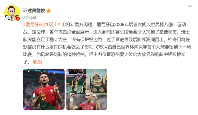 赛后,体育评述员詹俊发文:老将新星齐闪耀,葡萄牙自2006年后首次闯入世界杯八强!运动战、定位球,各个攻击点全面展示,进入到淘汰赛阶段葡萄牙队找到了最佳状态。瑞士队没能立足于稳守为主,没有保护好边路,过于冒进导致后防线漏洞百出,神奇门将佐默都没有什么发挥的机会就丢了6球。C罗冲击自己世界杯淘汰赛首个入球要留到下一场比赛,他仍然是球队的精神领袖,但主力位置恐怕要让位给大放异彩的新中锋拉穆斯了。