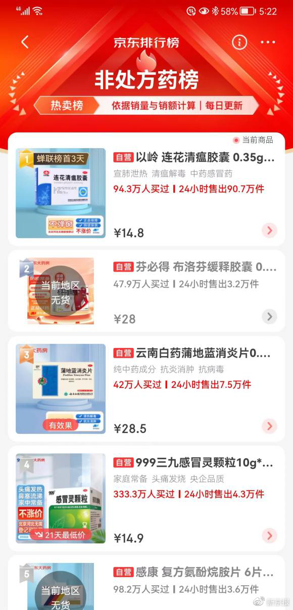 线上平台上,感冒药的需求也有所增加。京东12月5日的非处方药热卖榜上,排名前五位的均为感冒、退热类药品。