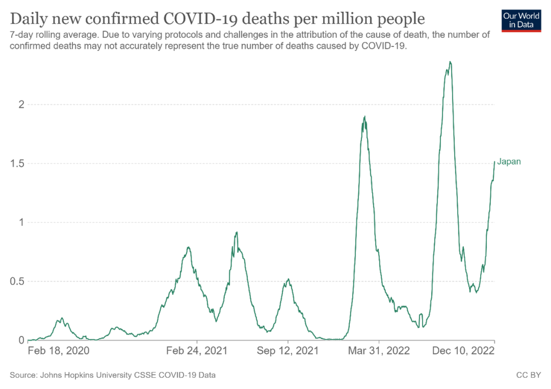 日本每日新增每百万人新冠确诊死亡病例数(2020年2月14日-2022年12月10日)