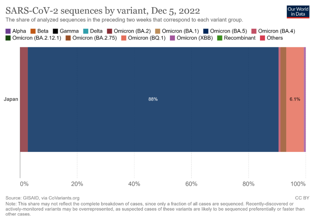 然而,当下没有直接证据表明,在日本,死亡人数的增长与BQ.1和BQ.1.1毒株的出现有确切关联。截至12月5日,统计数据显示,当下在日本占据主导地位的毒株仍是BA.5,占总病例数的87.76%,而BQ.1毒株的比例显示为6.12%左右。
