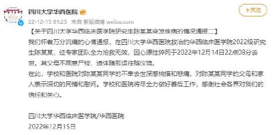 我们怀着万分沉痛的心情通报,在四川大学华西医院救治的华西临床医学院2022级研究生陈某某,经专家团队全力抢救无效,因心源性猝死于2022年12月14日22点08分去世。其父母不同意尸检,遗体随即运往殡仪馆。