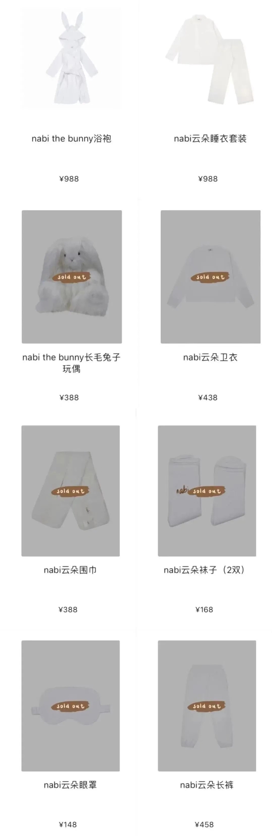 一周之后,据“nabi”官方小程序显示,该系列包括卫衣在内的6件商品已全部售罄,目前仅剩定价同为988元的浴袍和睡衣套装在售。从页面上显示的销售情况来看,欧阳娜娜的这一次“尝鲜”似乎效果不错。