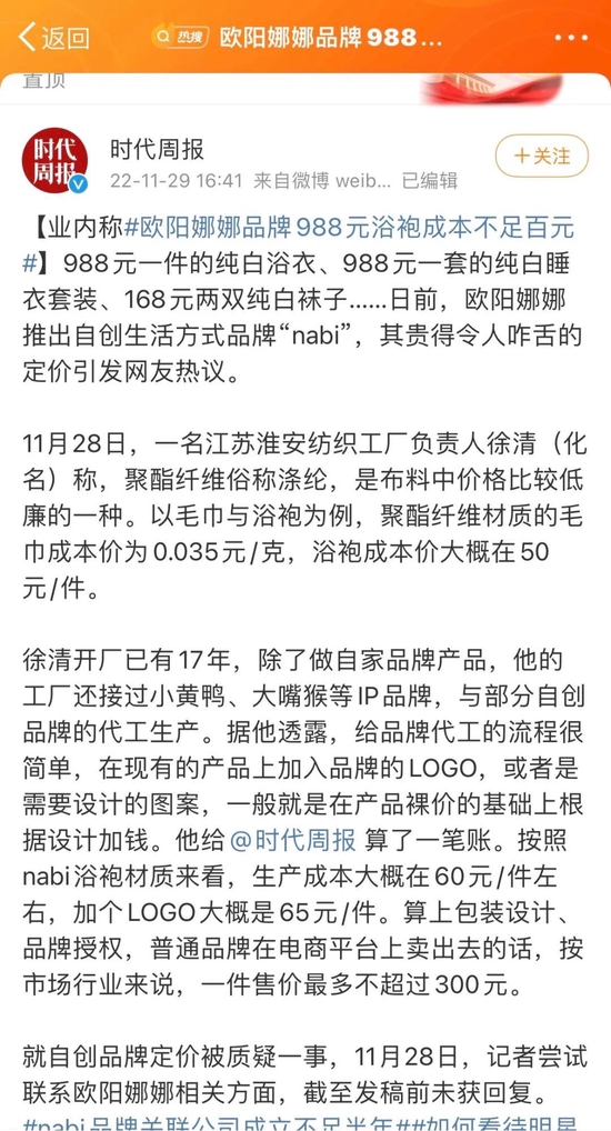 高定价和不匹配定价的面料,将欧阳娜娜再次推上热搜。#欧阳娜娜品牌988元浴袍成本不足百元#、#欧阳娜娜品牌关联公司成立不足半年#,这些声音将她好容易通过日常生活VLOG树立起的邻家少女形象和不错的路人缘,再次淹没。