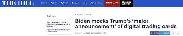 【环球网报道 记者 索炎琦】特朗普的“重大消息”揭晓了。据美国《国会山报》等媒体报道,美国前总统特朗普当地时间周四(15日)公布了其此前预告的“重大消息”内容,即宣传印有自己肖像的NFT数字藏品。报道称,这一前后反差引来嘲笑和质疑,美国总统拜登当天晚些时候也讽刺了一番。