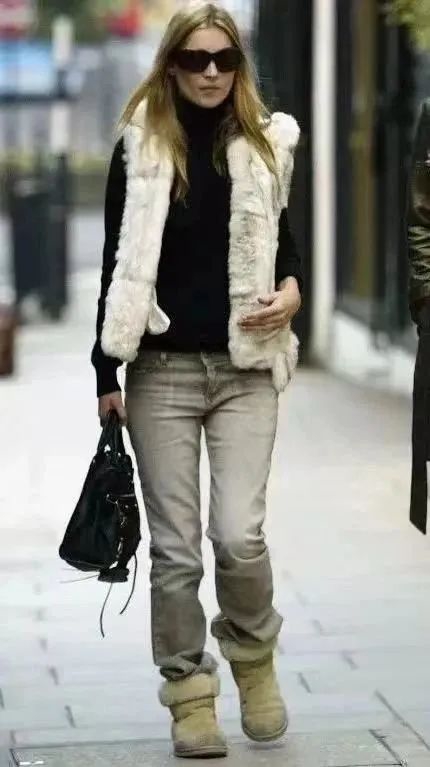只不过,那个时候对于鞋型本身偏笨拙的雪地靴,也因为当时的流行趋势,雪地靴的搭配较为简单,多与修身的牛仔或瘦腿裤混搭,起到保暖作用的同时,也可一定程度凸显腿部的纤细感。
