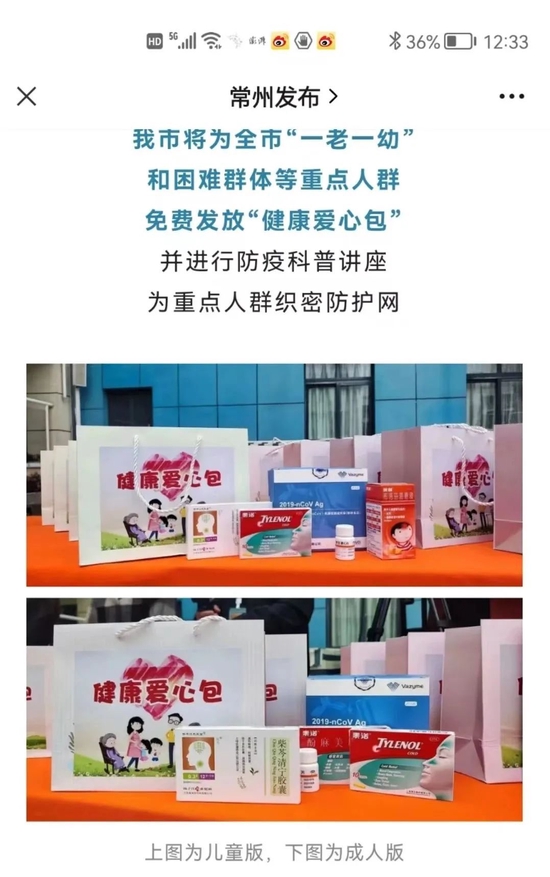 此前,12月8日,“常州发布”已在微信公众号发布消息称,即日起,该市将为全市“一老一幼”和困难群体等重点人群免费发放“健康爱心包”并进行防疫科普讲座为重点人群织密防护网。“健康爱心包”分为两类,一类是儿童版,一类是成人版,包内包括退烧药、感冒药、维生素C片和抗原检测试剂等家庭常备药物。