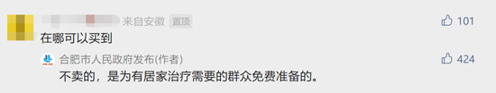 “合肥市人民政府发布”微信公众号在相关文章下回复网友“在哪可以买到”的问题称:健康包不卖的,是为有居家治疗需要的群众免费准备的。