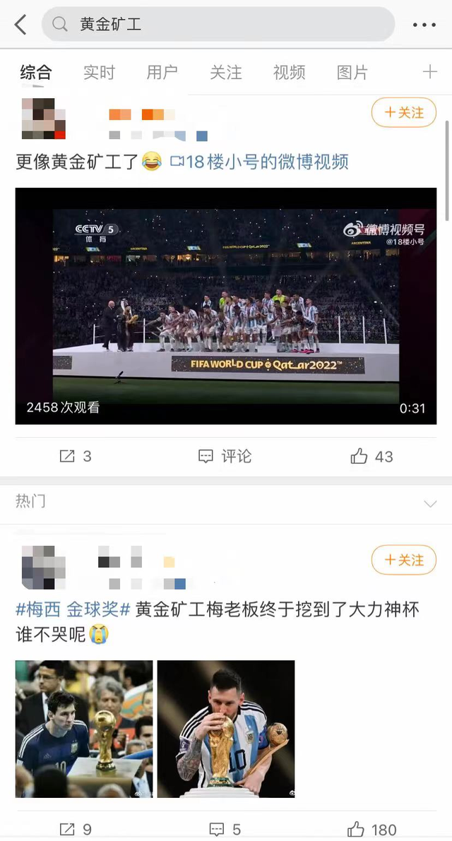 此外,“黄金矿工”也登上热搜,网友趣评梅西获得金球奖像“黄金矿工”称:“黄金矿工梅老板终于挖到了大力神杯,谁能不哭呢?”