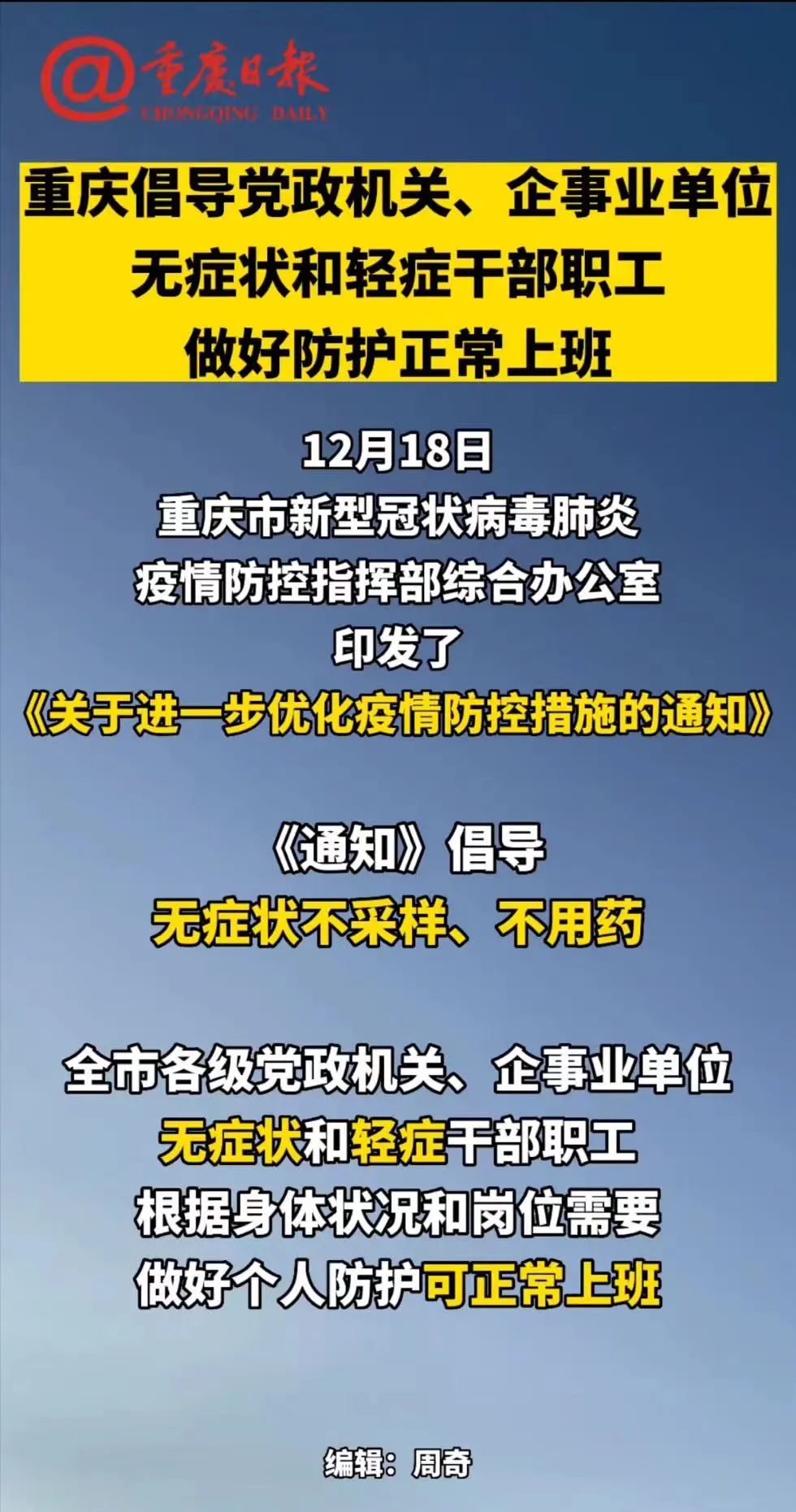 同日,重庆市新型冠状病毒肺炎疫情防控指挥部综合办公室印发《关于进一步优化疫情防控措施的通知》(以下简称《通知》)。通知中倡导无症状不采样、不用药,“全市各级党政机关、企事业单位无症状和轻症干部职工根据身体状况和岗位需要,做好个人防护可正常上班。”