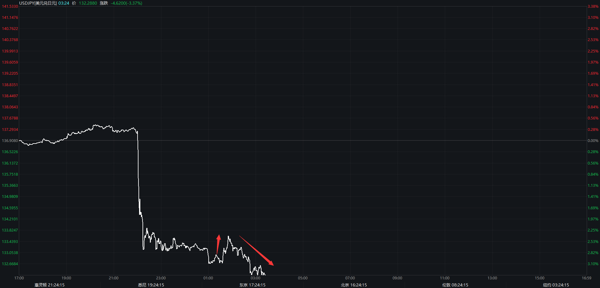 随后……呃,又涨了!目前美元兑日元已刷新了日内低位132.28。