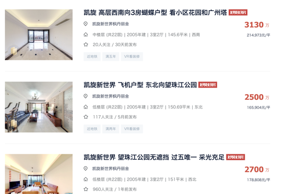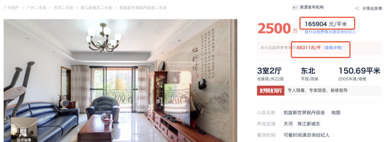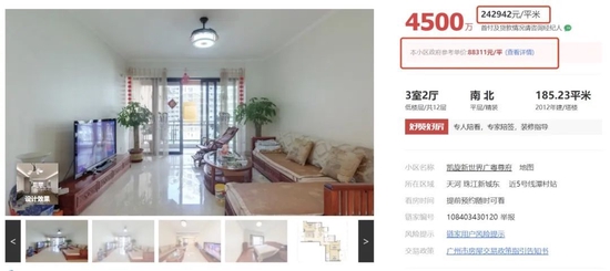 12月21日,记者看到,属于广州首批发布二手房交易参考价的小区凯旋新世界,目前在链家平台展示的一套房源挂牌总价为4500万元,挂牌均价242942元/平方米,而政府参考单价为88311元/平方米。