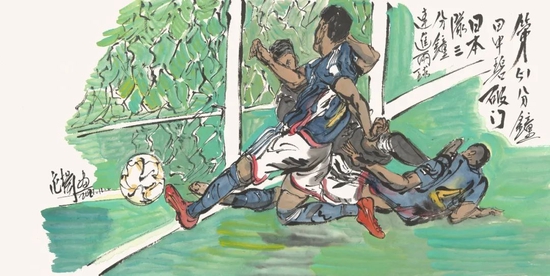 在范扬先生看来,用传统的中国画笔墨精髓,结合现代新时代的发展,表现周围真实生动的生活场景,是当代画家的一个课题,他正在这样践行着。能不能用中国画的笔墨来表现激烈的体育运动,表现刚刚正在发生的世界杯故事,是一种尝试。