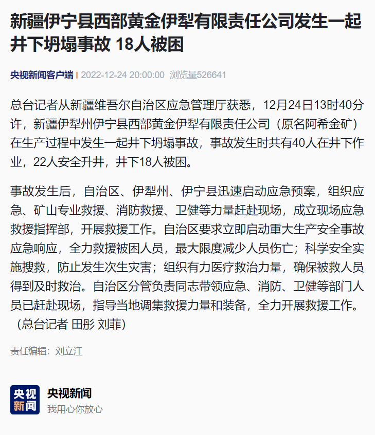 据央视新闻客户端消息,总台记者从新疆维吾尔自治区应急管理厅获悉,12月24日13时40分许,新疆伊犁州伊宁县西部黄金伊犁有限责任公司(原名阿希金矿)在生产过程中发生一起井下坍塌事故,事故发生时共有40人在井下作业,22人安全升井,井下18人被困。详情: