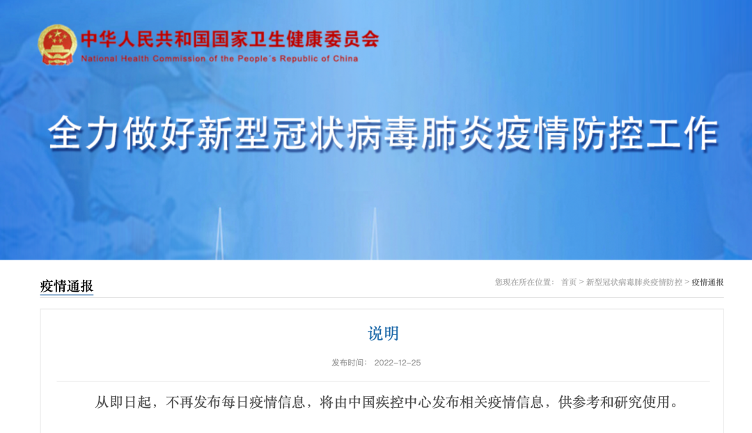 12月25日,国家卫健委官网发布,从即日起,不再发布每日疫情信息,将由中国疾控中心发布相关疫情信息,供参考和研究使用。