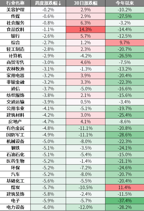 本周申万一级31个行业中来看,美容护理、传媒、社会服务等行业较为抗跌;电力设备、电子、建筑装饰等行业表现落后。