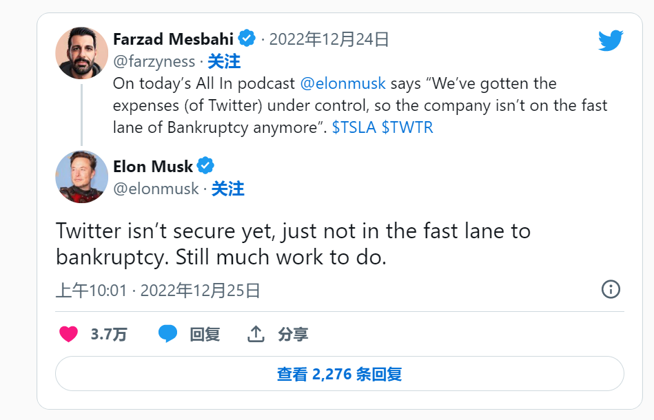 在后续发布的推文中,马斯克还补充道,“推特目前还不安全,只是还没有走上破产的快车道。仍然有很多工作要做。”
