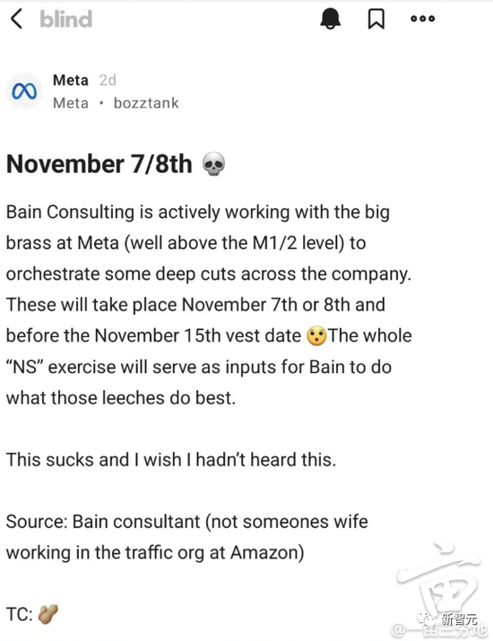 想当初,Meta在正式发起裁员之前,也有人发帖爆料称:‘贝恩咨询正在为Meta制定大裁员计划,预计11月7-15之间动手’。