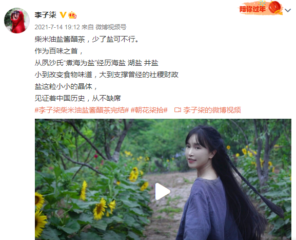2021年7月14日,李子柒发布了关于“盐”的视频,此后便停更了,至今已有500多天。