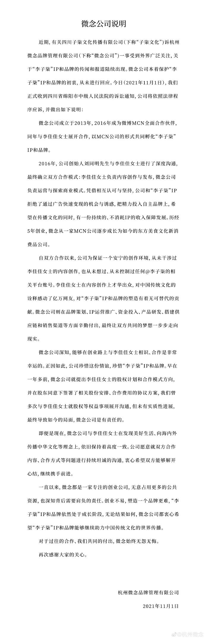 此前2021年10月,有媒体报道称,李子柒与签约MCN杭州微念产生分歧。随后,双方多次对簿公堂。