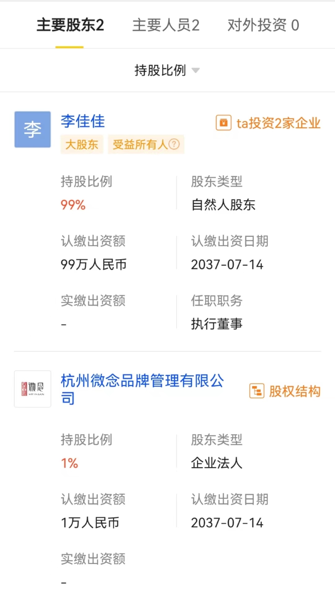 值得一提的是,启信宝App显示,近日,四川子柒文化传播有限公司发生多项工商变更:监事由刘同明变更为蒲倩云;杭州微念品牌管理有限公司持股比例由51%减至1%,李子柒(李佳佳)持股比例由49%增至99%。目前,李子柒为该公司疑似实际控制人。