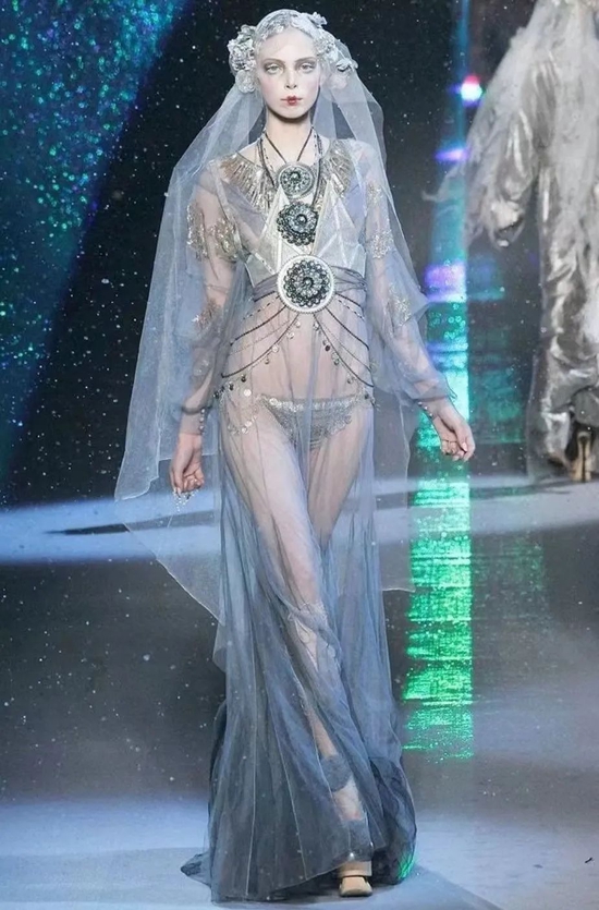 秀场使用了激光创造了奇幻隧道的效果,闪闪发光的片状物模拟雪花飘落,秀场变成了冰雪世界,模特们霜冻的脸颊好似冰雪鬼魅的新娘,海盗爷用戏剧性的哥特式时尚创造了一个平行的幻想世界。