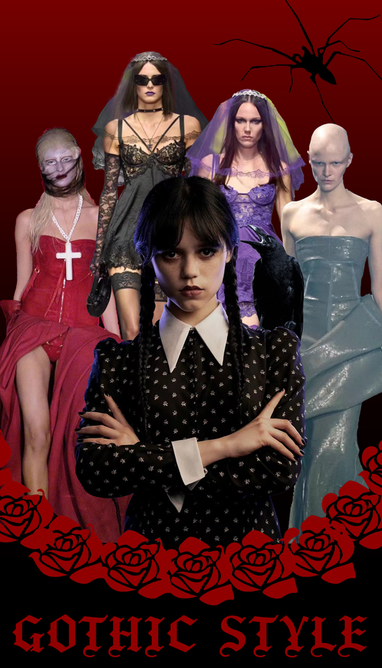 哥特风时尚往往会以暗黑的妆容、仙气的薄纱、夸张的饰品等为标志,例如外表冷艳端庄的亚当斯夫人常年穿着塑身衣、包身长裙、暗黑系裙装,夸张怪诞的同时却带有阴郁和妖艳。