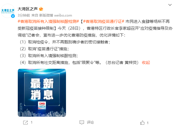 【香港取消所有入境强制核酸检测及所有社交距离措施】财联社12月28日电,今天,香港特区行政长官李家超召开“应对疫情指导及协调组”记者会,宣布进一步优化香港防疫措施,优化详情如下:(1)取消检疫令,并不再甄别确诊者的密切接触者;(2)取消“疫苗通行证”措施;(3)取消所有入境强制核酸检测;(4)取消所有社交距离措施,包括“限聚令”等。