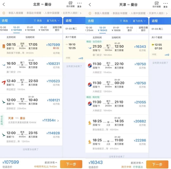 更为夸张的是,12月31日北京→曼谷的元旦假期往返机票出现了“天价”,为10.75万元,且需要转机2次方可到达。天津→曼谷的往返机票最便宜也需要1.6万元,目前也没有直飞班次。