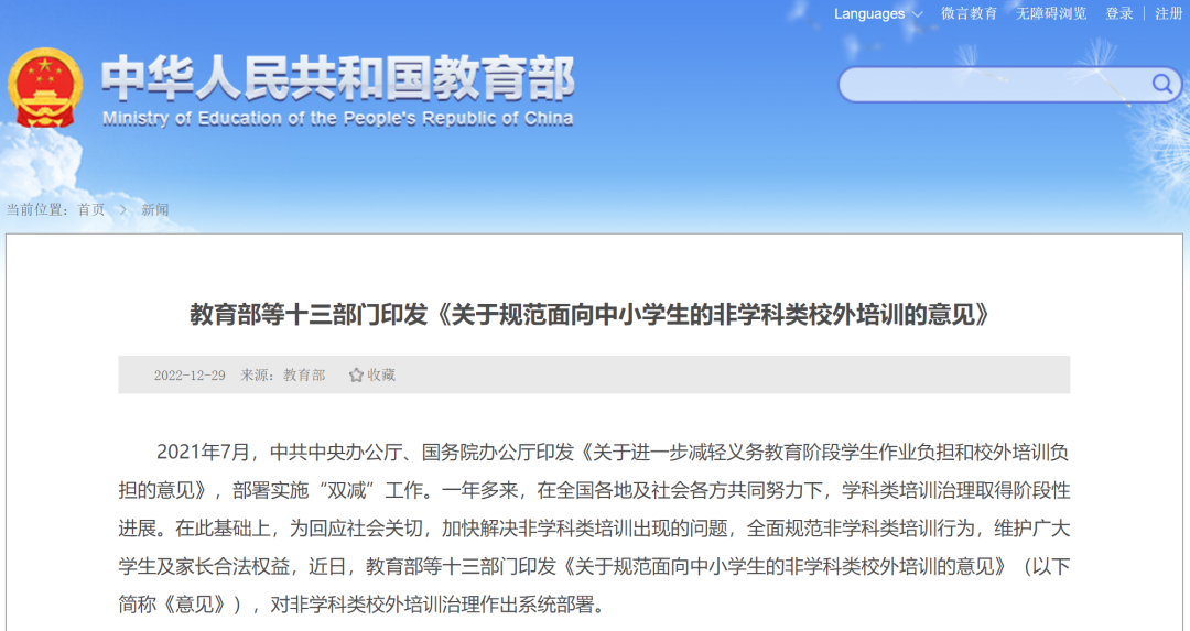 12月29日,据教育部网站消息,近日,教育部等十三部门印发《关于规范面向中小学生的非学科类校外培训的意见》,对非学科类校外培训治理作出系统部署。