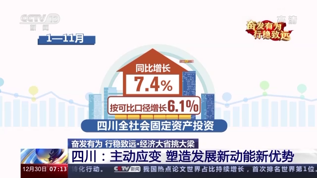 新产业引领新发展,截至目前,四川高新技术企业和科技型中小企业分别达到了1.4万家和1.8万家。今年前11个月,四川高技术产业增加值增长11.4%,五大现代产业中能源化工产业、先进材料产业增加值分别增长10.6%、9.9%;科学研究和技术服务业营业收入增长17.2%。