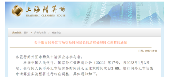 上海清算所今天也发布公告称,根据中国人民银行、国家外汇管理局公告〔2022〕第17号,自2023年1月3日起,银行间人民币外汇市场交易时间延长至北京时间次日3:00。银行间外汇市场集中清算业务流程将进行相应调整,具体通知如下: