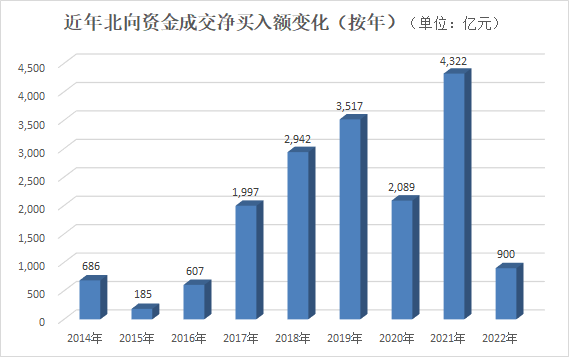 在疫情冲击、国际局势风云变幻等多重因素的影响下,2022年北向资金依旧实现对A股的净买入,全年净买入约900亿元。
