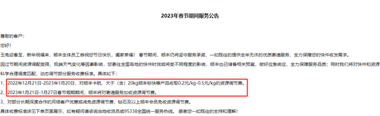 据了解,今年春节,快递企业将上调快递费用。根据顺丰公告,因过节期间资源调配受限、极端天气变化等因素影响,2022年12月21日-2023年1月20日,公司对顺丰卡航、大于(含)20kg顺丰标快等产品收取0.2-0.5元/kg的资源调节费。而1月21日-27日春节假期期间,顺丰将对寄递服务加收资源调节费。