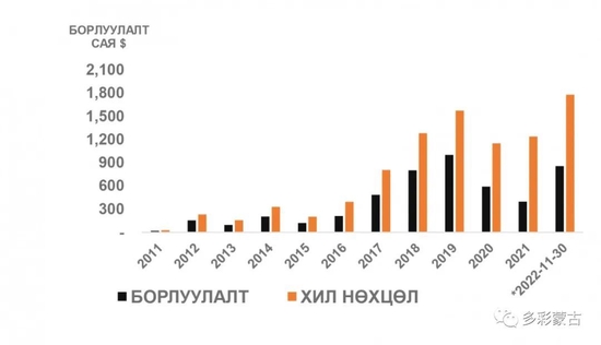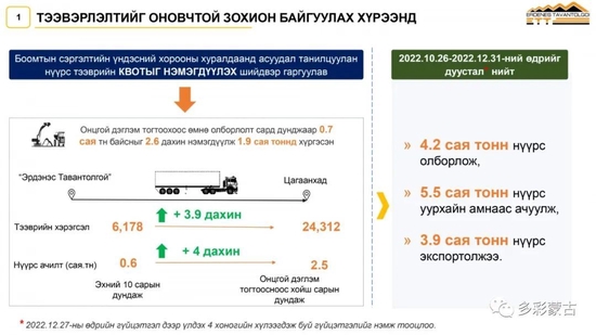 从任务完成情况看,蒙古国政府于10月26日对“额尔德尼斯塔奔陶勒盖”有限公司实施紧急状态,派全权代表之后,煤炭出口增长2倍,煤炭装运增长4倍,销售收入增长4.95亿美元,今年的销售总收入达11亿美元。