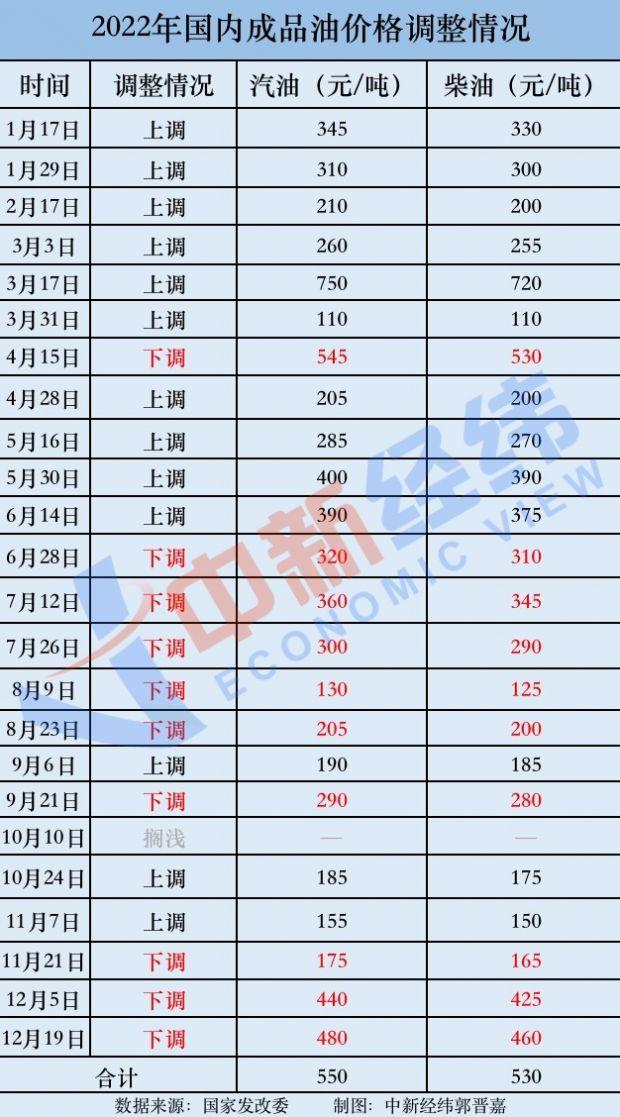 据中新经纬梳理,2022年国内成品油经历24轮调整,年末以“三连跌”收官。汽油整体价格累计上调550元/吨,柴油价格累计上调530元/吨,总体呈现“13涨10跌1搁浅”格局。