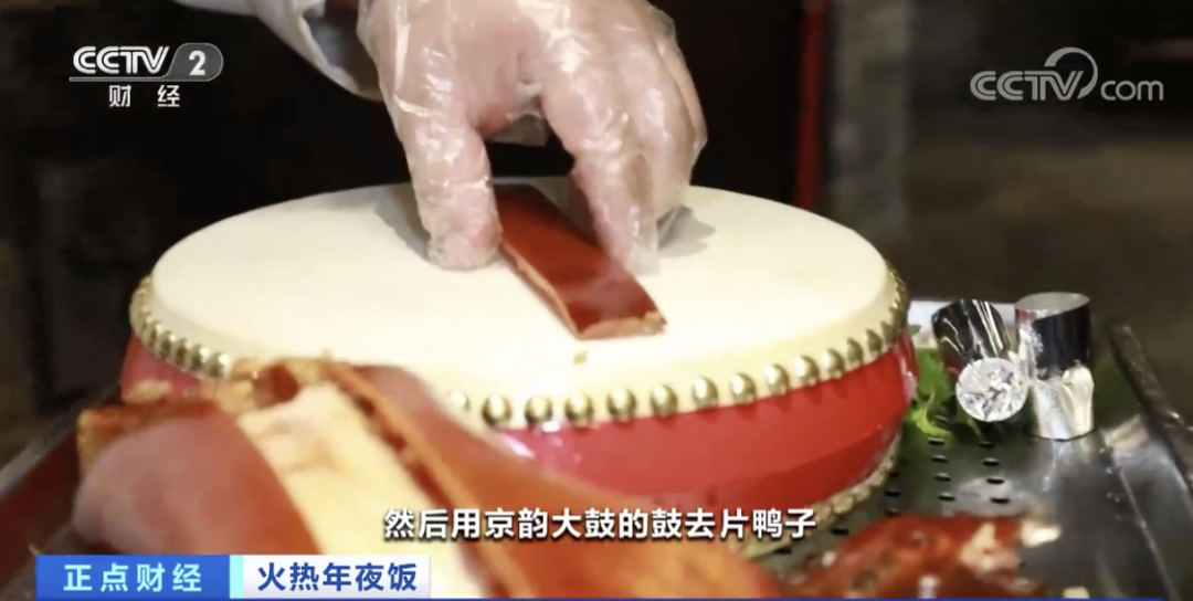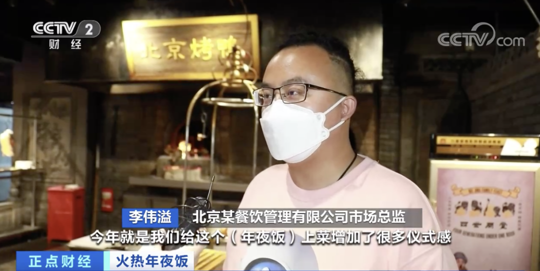 北京某餐饮管理有限公司市场总监 李伟溢:今年我们给年夜饭上菜增加了很多仪式感,比如说我们的吉祥锣鼓烤鸭会很喜庆,用京韵大鼓的鼓去片鸭子,上菜的时候会敲锣打鼓,给大家吉祥如意的感觉。